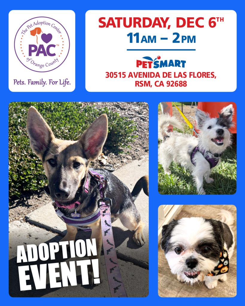 We will be bringing some of our dressed-up, adorable, adoptable pups to PetSmart in Rancho Santa Margarita, 30515 Avenida de las Flores, on Saturday, December 6, 2025 from 11 AM – 2 PM. Come meet them, donate to the Pet Pantry for RSM Cares, and give a pup in need a home for the holidays.